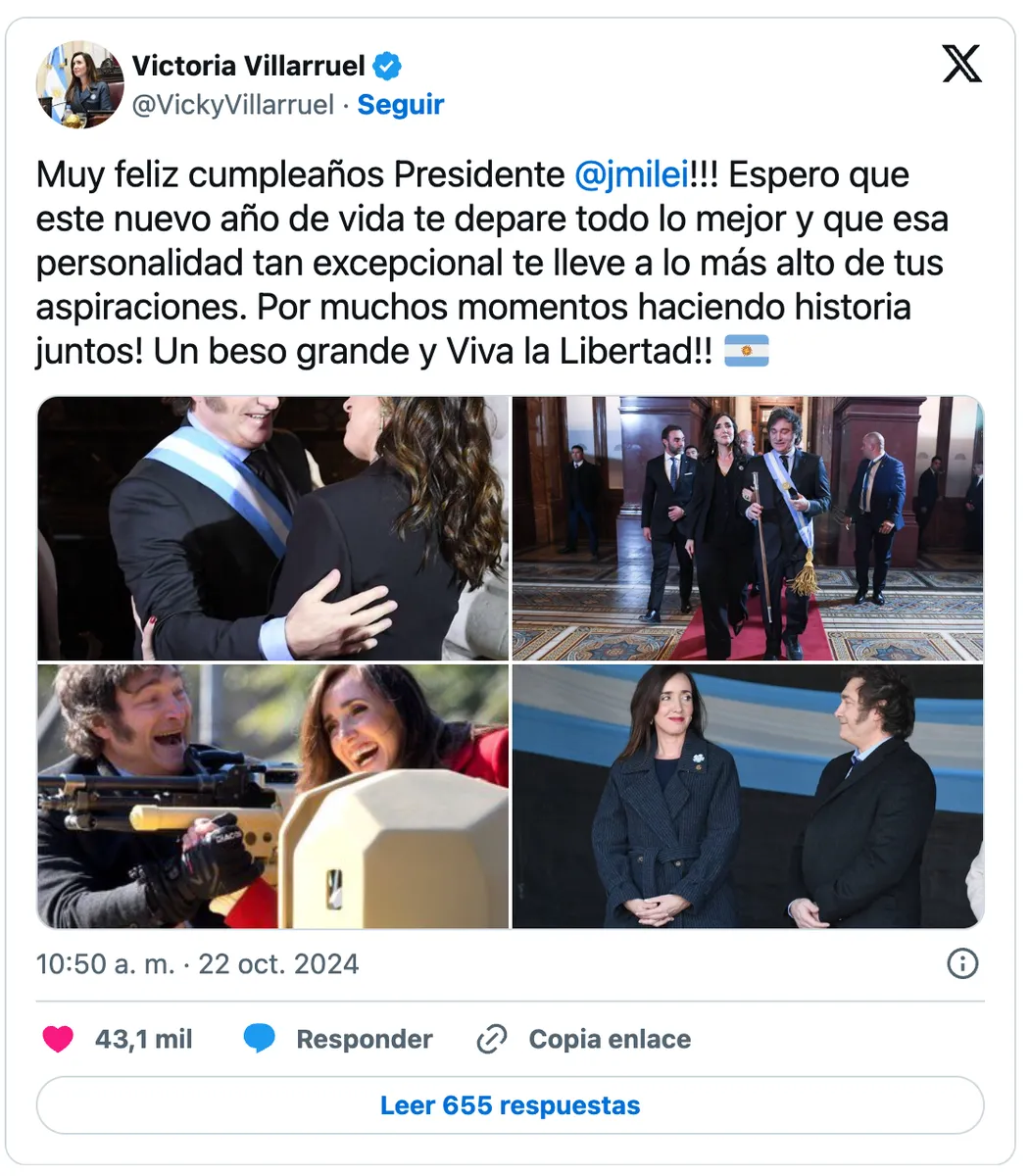 This applies also to his memes and pictures on Twitter and the like, and it is not just him but also Villaruel. It was Milei's b-day recently, and she found no better picture of them two but one with a fire gun.