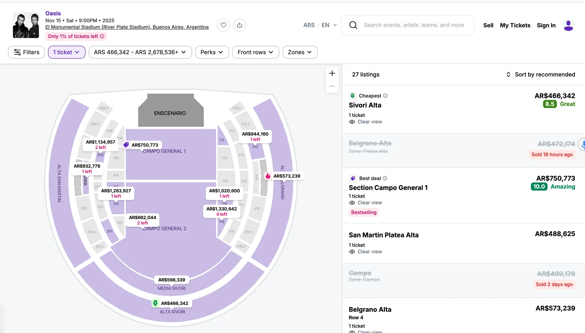 Iconic Brit band Oasis is coming to South American and will be playing at the River Stadium on November 15 and 16. Both dates went sold out as soon as tickets were made available, and are only available as resales. Prices now go from, 450k pesos to over 1 million pesos!