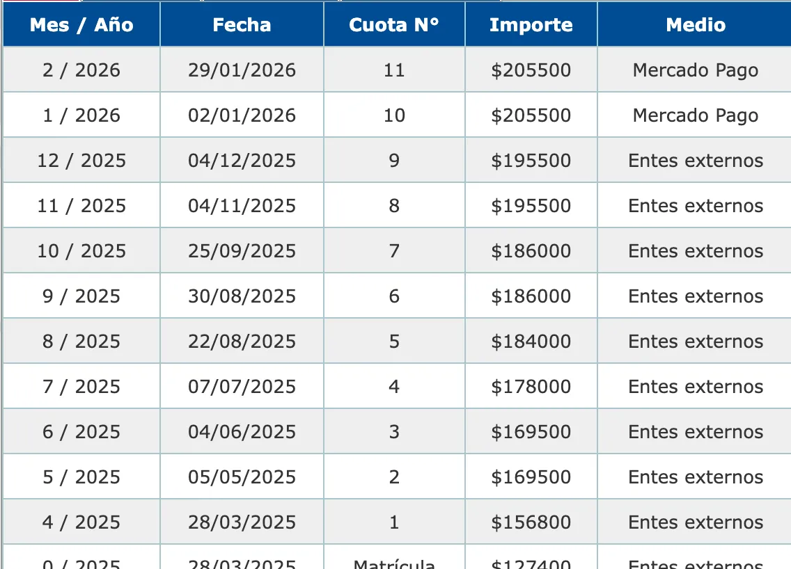 At the same time, last year I started another career, this time 100% remote, at another University in Argentina. My experience has been quite different, and it will make for an interesting comparison. This is the fee schedule of my remote program. As you can see, the monthly installments run from April to February, plus an enrollment fee (matrícula).